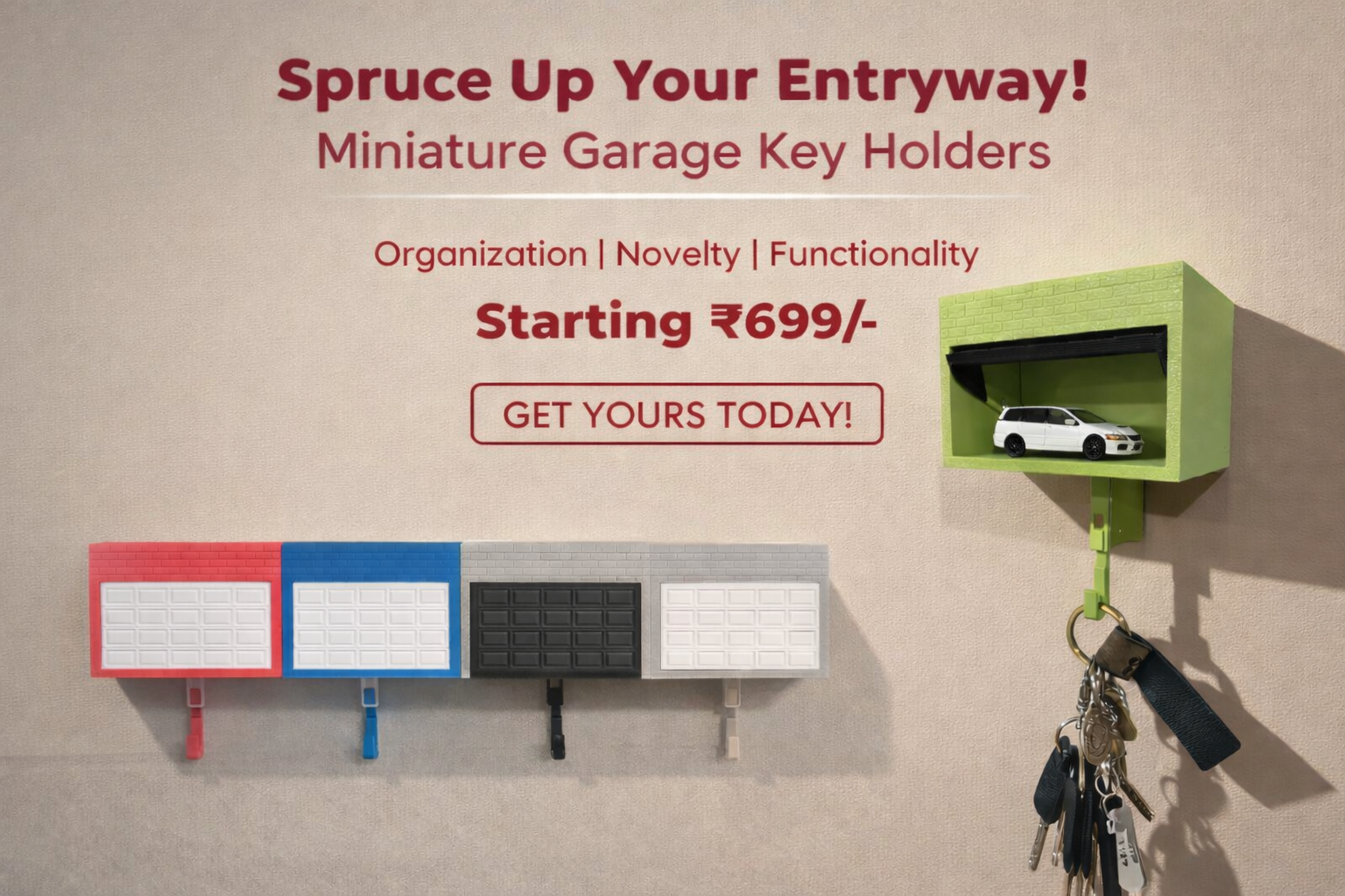Miniature Car Garage Key Holder with 1:64 Scale Model â Wall Mount with Opening Garage Door (With Car)